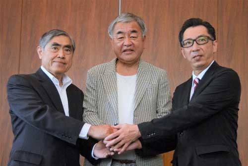 「JR予土線圏域の明日を考える会」の総合アドバイザーに就任し、正副会長と握手する隈研吾さん(中央)=28日午前、松山市堀之内から